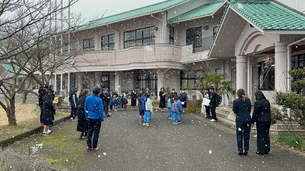 ・志学小中学校の卒業式はとても感動的です。少人数の中とても関係の濃い生活を送っていることもあり思いもひとしお。特に中学校の卒業式には保育園・小学生までがお祝いとお別れに集います。お互いに声を掛け合う姿はとても良い光景です。