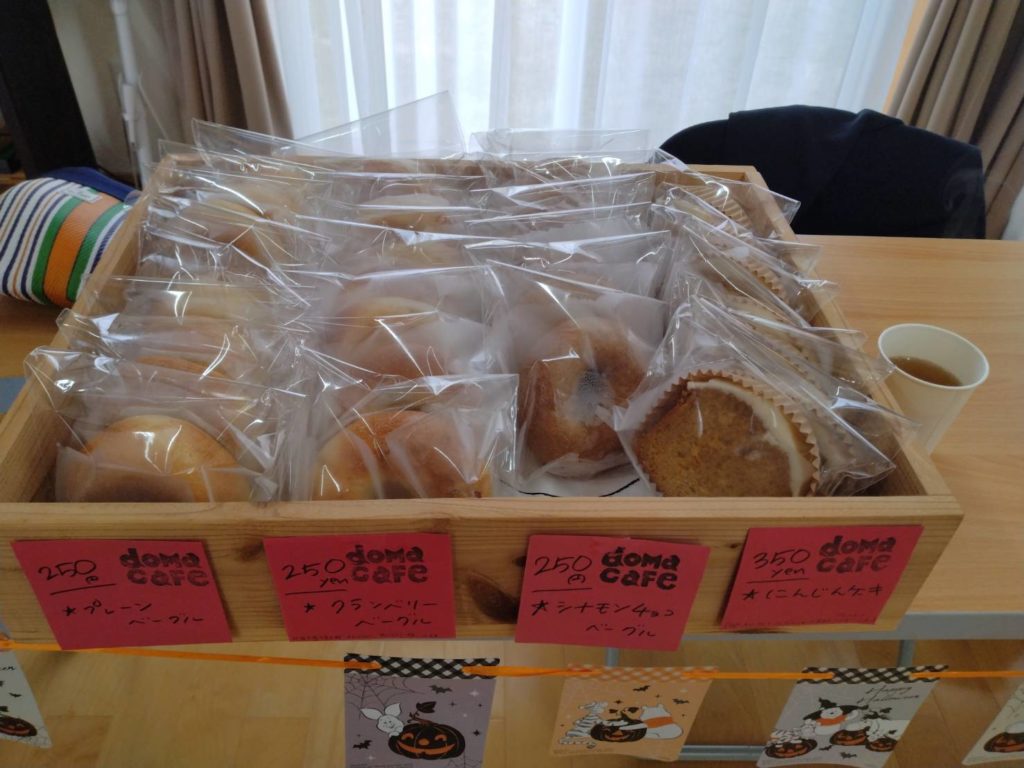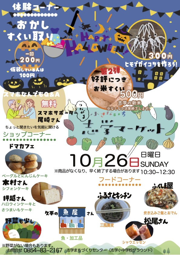 10月の志学マーケットは「ハロウィンマーケット」お菓子すくいやガイコツ人形作りワークショップ、スマホQ&A、地元出店、蕎麦の販売などを行いました。