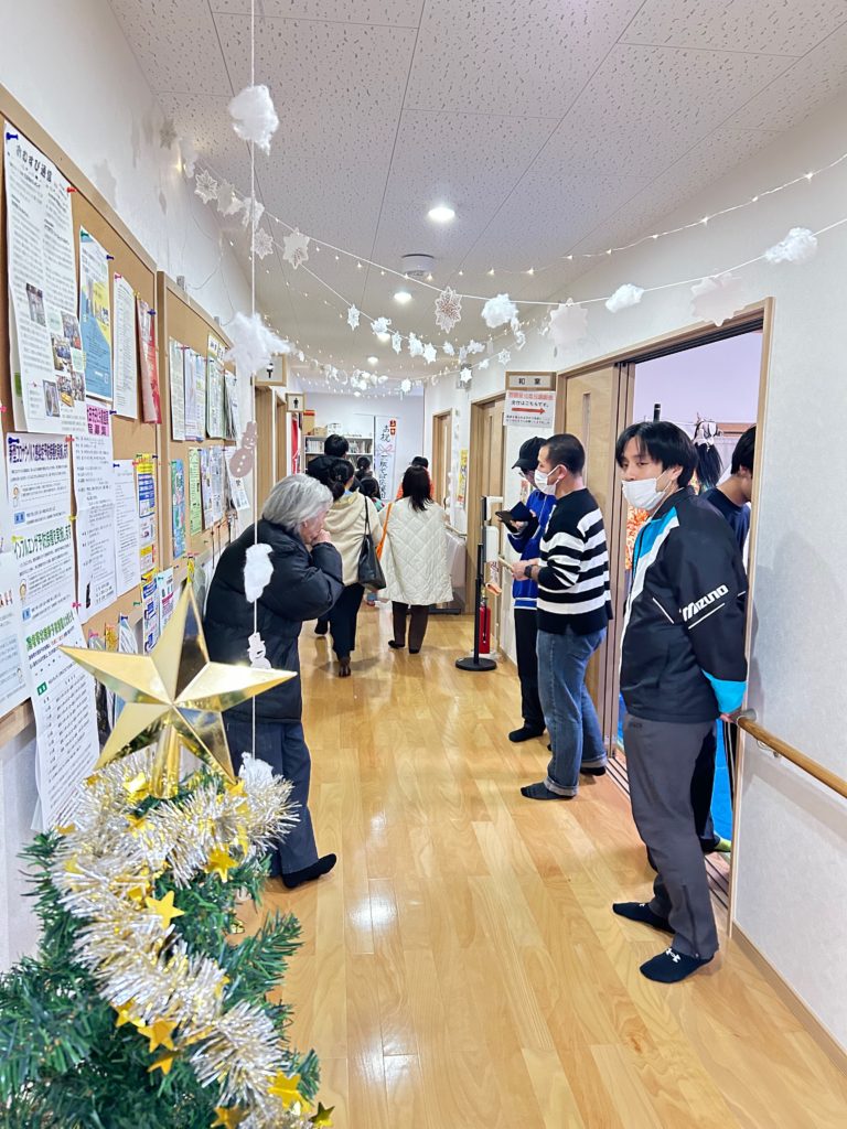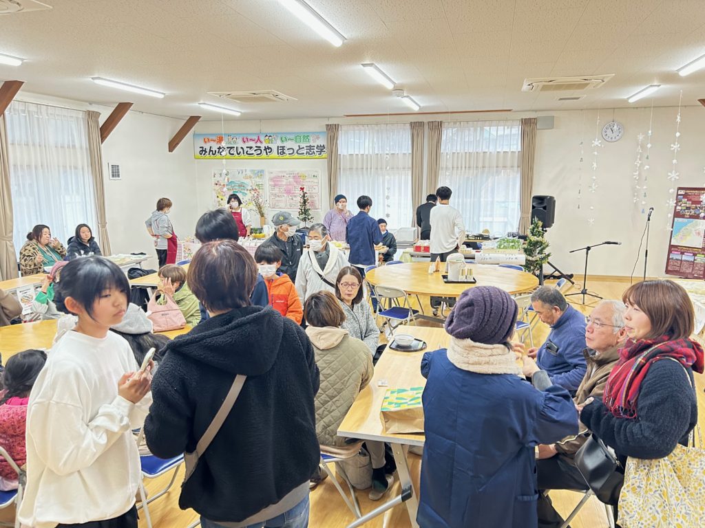 12月の志学マーケットはクリスマスの飾り付けを行い、賑やかに開催しました。中学生の授業の一環で神楽を広めたいという生徒のワークショップや地元小中学校出身のコンサートなども行い、人出も多く、同日行った福引も好評で、楽しいひと時となりました。